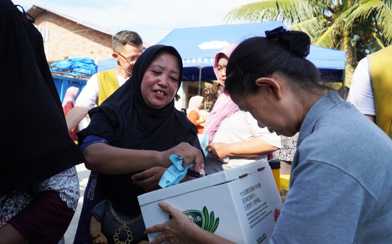 Para warga penerima bantuan dengan antusias menukarkan kupon yang diberikan relawan saat survei dengan paket sembako. Diiringi lagu-lagu Tzu Chi, para relawan dengan sukacita dan bersemangat saling bekerja sama dan bergotong royong membagikan paket sembako kepada warga walaupun matahari pagi cukup menyengat.