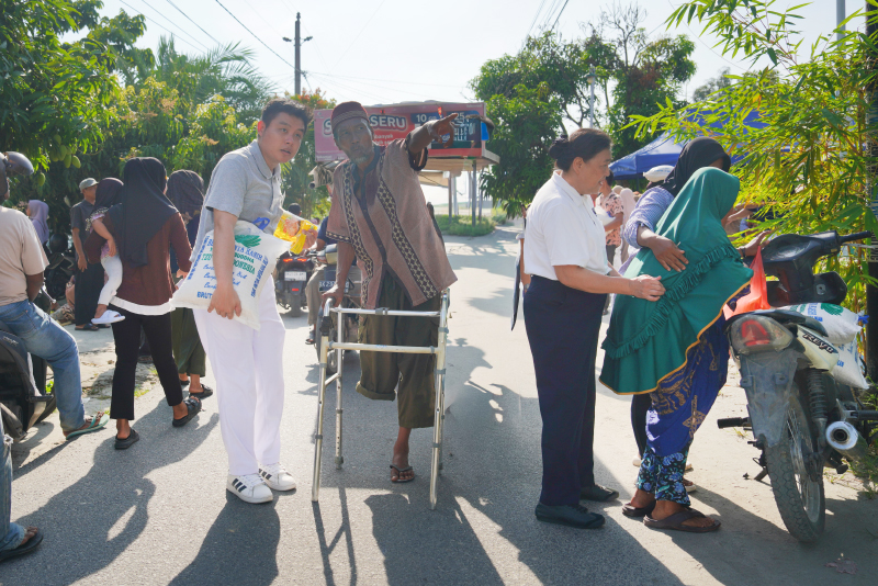 Hal yang sama dirasakan oleh Erwin Ravindo (65) yang terharu dengan bantuan sembako dari Tzu Chi. Istrinya telah meninggal karena sakit komplikasi dan anak-anaknya tidak mempedulikannya. Ia mengalami kecelakaan lalu lintas akhir 2025 lalu sehingga satu kakinya harus diamputasi. Sekarang ia berjalan dengan menggunakan penyangga dan tinggal di rumah adik laki-lakinya. Keterbatasan yang dimilikinya tidak menghalangi semangatnya untuk datang mengambil bantuan sembako.