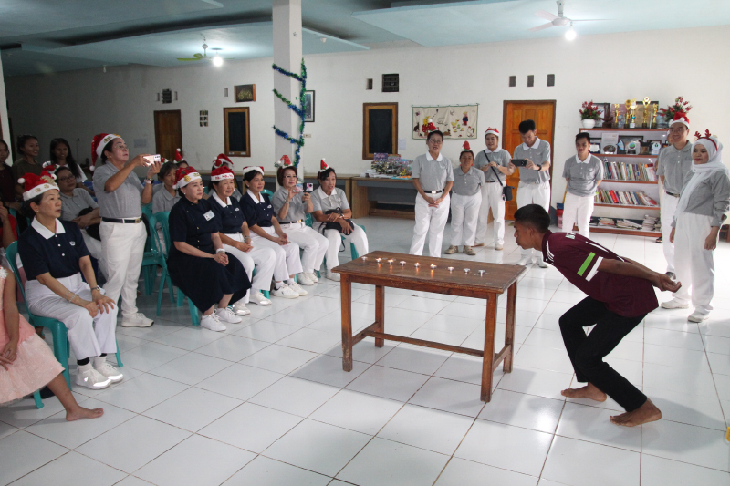 Anak-anak diajak bermain games Natal, salah satunya meniup lilin paling banyak dan mengucapkan Merry Christmas.