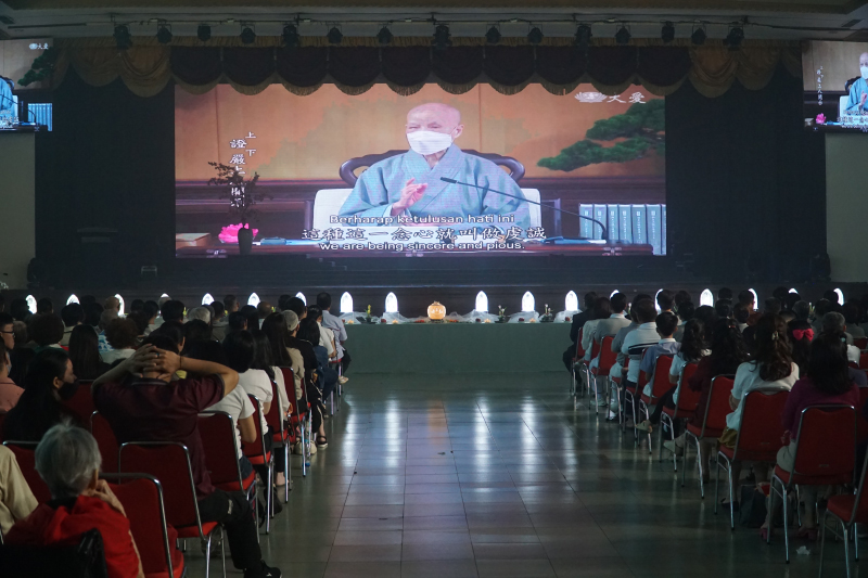 Hadirin juga menyaksikan ceramah Master Cheng Yen tentang Bulan Tujuh Penuh Berkah, berisi ajakan untuk berpandangan benar, bervegetarian, berbakti pada orang tua, dan membebaskan makhluk dari penderitaan.