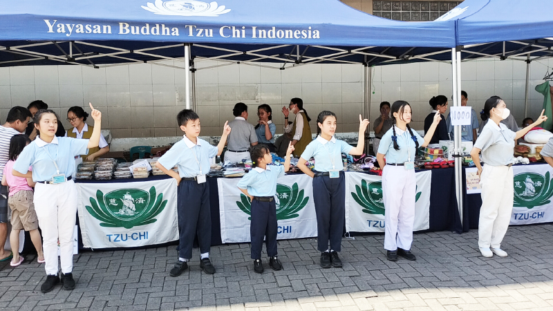 Murid-murid kelas budi pekerti memperagakan bahasa isyarat tangan untuk menarik minat dan perhatian orang-orang yang lewat untuk mengunjungi stand-stand Tzu Chi.