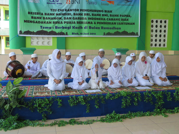 Sebelum berbuka puasa, relawan Tzu Chi Biak bersama-sama dengan para undangan memperagakan isyarat tangan satu keluarga. Beberapa undangan ternyata sudah tak asing lagi dengan isyarat tangan karena pernah mengikuti kegiatan Tzu Chi Biak. Sementara anak-anak dari remaja Masjid Agung baiturrahman menampilkan lagu –lagu Qasidah.