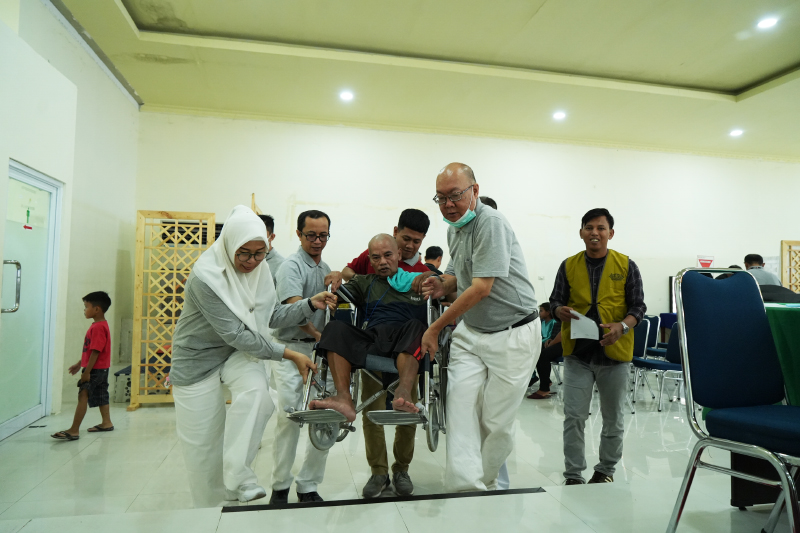 Relawan bergotong royong membantu seorang pasien yang kesulitan mobilitas.