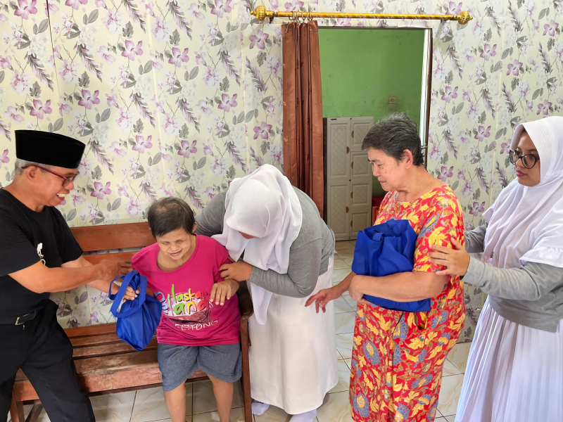 Nova (kiri) dan Yan iko (kanan) menyerahkan bingkisan untuk oma-oma penghuni panti.
