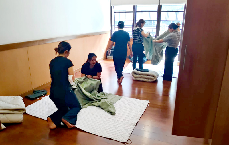 Sebanyak 44 kasur dipasangi seprei lengkap dengan sarung selimut dan sarung bantal oleh para peserta relawan Tzu Chi dan mahasiswa/i Binus Online yang bekerja bersama dalam semangat gotong royong.