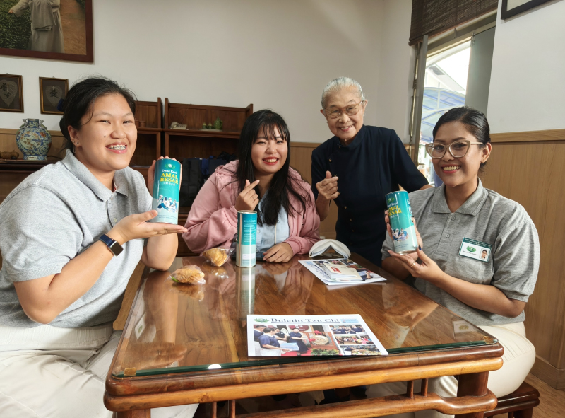 Venny, Cecilia, dan Gween (dari kiri ke kanan) berfoto bersama relawan Tzu Chi. Semangat kebajikan tetap terpancar meskipun usianya relawan telah lanjut, mencerminkan ketulusan dalam melayani sesama.