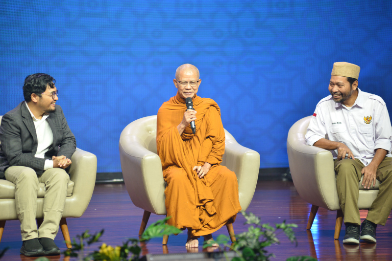 Melalui dialog yang hangat dan penuh makna, para narasumber yaitu Dr. A. Ginanjar Sya'ban (kedua dari kiri), Bhikkhu Dhammasubho Mahathera (tengah), Azmi Abubakar (kedua dr kanan), dan Andre Zulman (kanan) berbagi pandangan mengenai nilai-nilai kebersamaan dan toleransi.