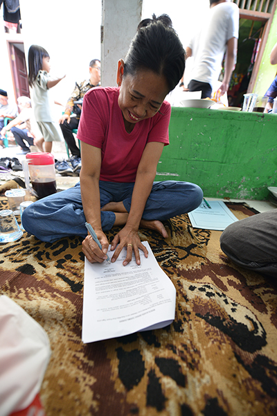 Rasa bahagia dan haru juga tak bisa dibendung Murtiah adik dari Kartiwo. Saat menandatangani surat perjanjian serah terima rumah, ia pun tampak tersenyum sambil membubuhkan tanda tangan. “Senang, dari dulu saya doa-doain rumah saya bisa direnovasi. Pas tandatangan saya ngebatin ‘berarti rumah saya jadi dibedah’,” ungkap Murtiah dengan mata berkaca-kaca.