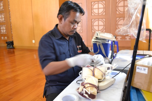 Petugas PMI sedang mengemas kantong darah yang telah selesai diambil untuk disimpan dalam kotak pendingin.