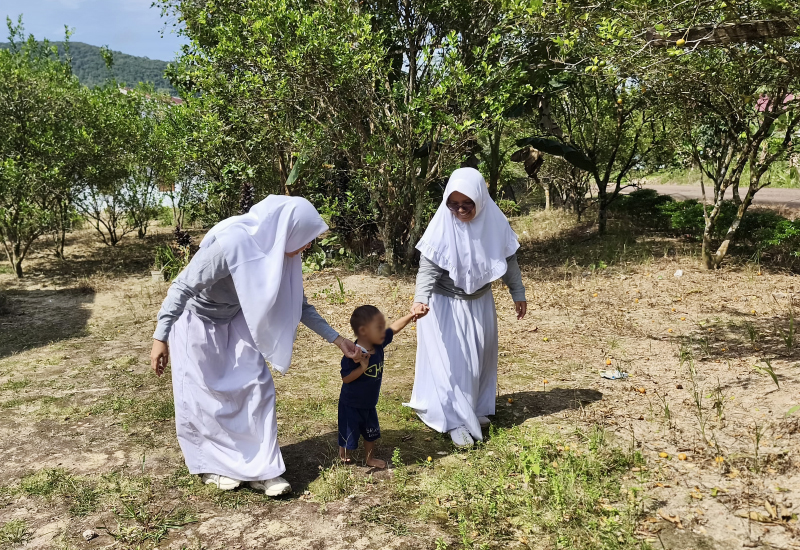 Sore itu, Azmi berdiri di sebelah ibunya membuka pintu rumah untuk menyambut relawan yang datang berkunjung untuk keempat kalinya. “Ini Bu, Azmi mau tunjukkan ke ibu kalau langkahnya udah mulai banyak. Sudah sampai ke dapur dia sendirian, kalau mamak-nya lupa kunci pintu bablas masuk kamar mandi mainan air,” ujar Muslihah.
