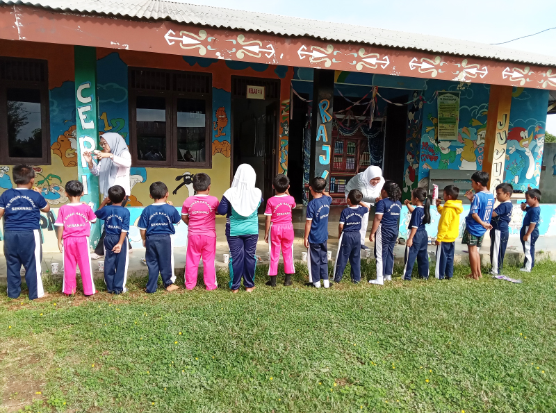 “Ayo jangan keliru cara gosok giginya ya,” ungkap Bidan Martini sembari berkeliling melihat siswa praktik gosok gigi.