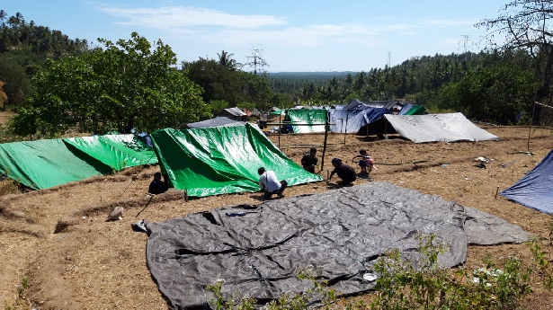 darurat yang dibangun oleh warga korban gempa Lombok diatas lahan tanaman kacang dan persawahan yang