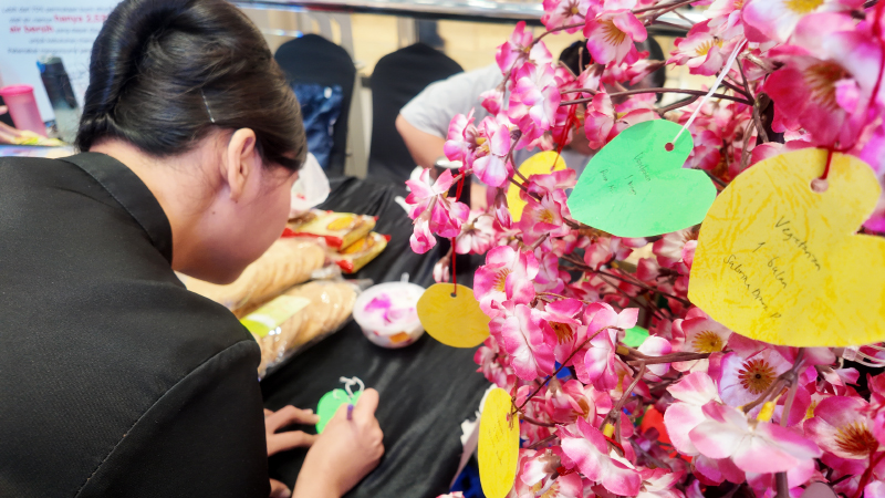 Setiap orang yang bertekad mencoba hidup vegetarian menuliskan niatnya di kertas berbentuk hati dan menggantungnya di Pohon Mei Hua simbol harapan untuk dunia yang lebih sehat, damai, dan penuh kasih.