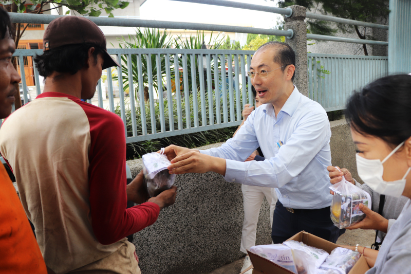 Henking Wargana, Wakil Ketua Tzu Chi Bandung, turut membagikan takjil kepada para pekerja bangunan yang tengah dalam perjalanan pulang setelah seharian bekerja.