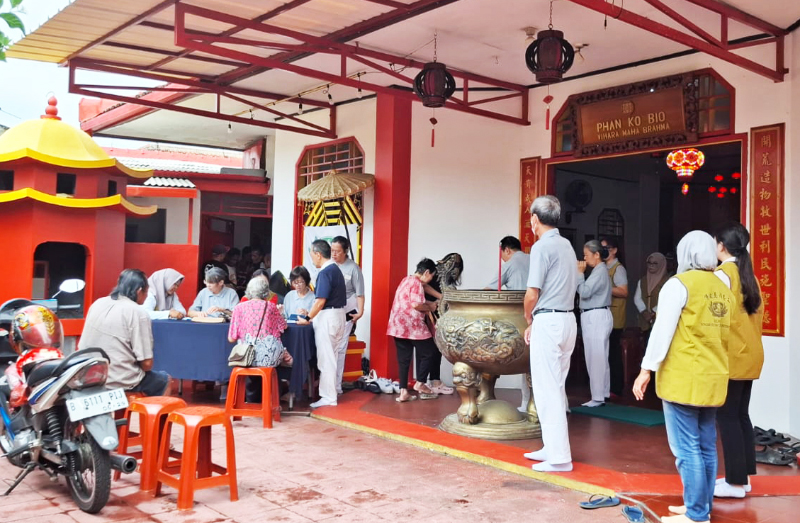 Suasana Vihara Maha Brahma (Phan Ko Bio) yang dijadikan tempat penyaluran beras paket Imlek 2026. Relawan Tzu Chi melayani pengambilan kupon beras yang sebelumnya dibagikan ke warga untuk di tukarkan dengan paket beras 10 kg.