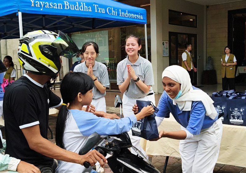 Seorang anggota Tzu Ching dengan ramah memberikan paket takjil kepada seorang anak dan orang tuanya yang sedang mengendarai motor melintas di depan kantor Tzu Chi Pekanbaru.