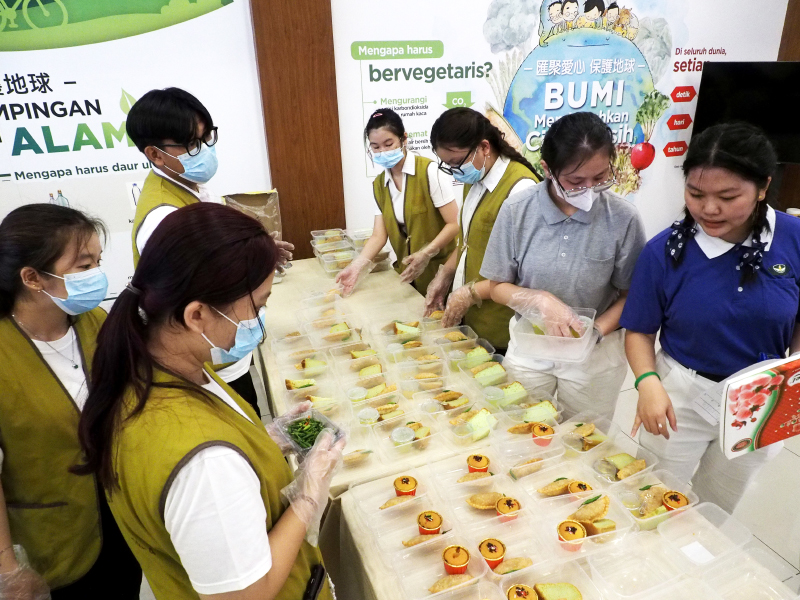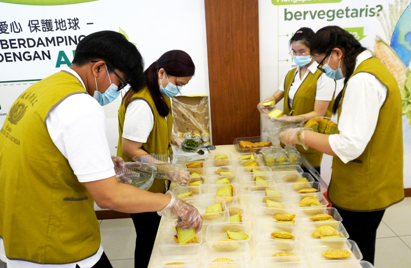 Febrianne (kanan) mengajak muda-mudi Tzu Ching menata kue-kue untuk panganan berbuka puasa. Febrianne mengajak anggota Tzu Ching untuk bersumbangsih dan memanfaatkan waktu dengan berbuat baik untuk sesama.