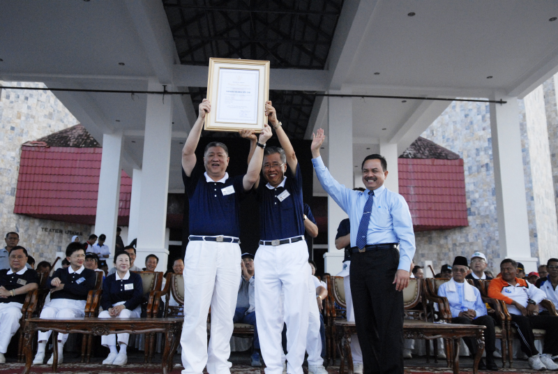 Sugianto Kusuma, Wakil Ketua Yayasan Buddha Tzu Chi Indonesia dan Widya Kusuma relawan Tzu Chi dari Padang mengangkat penghargaan ungkapan terima kasih yang diberikan oleh Walikota Padang, Fauzi Bahar.