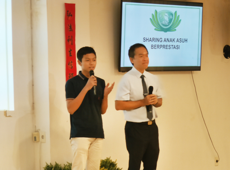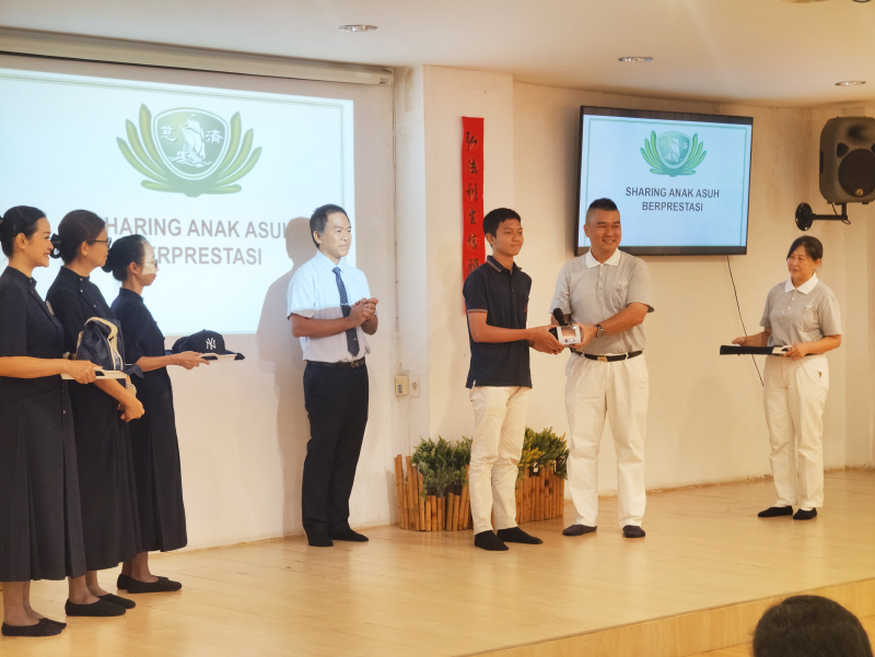 Relawan tzu Chi memberikan apresiasi dan penghargaan kepada Matthew G.C Panjaitan seorang anak asuh yang berprestasi Matthew G.C Panjaitan juara 2 nasional kompetensi wawasan dan pengetahuan IBJ Telkomsel 2025.