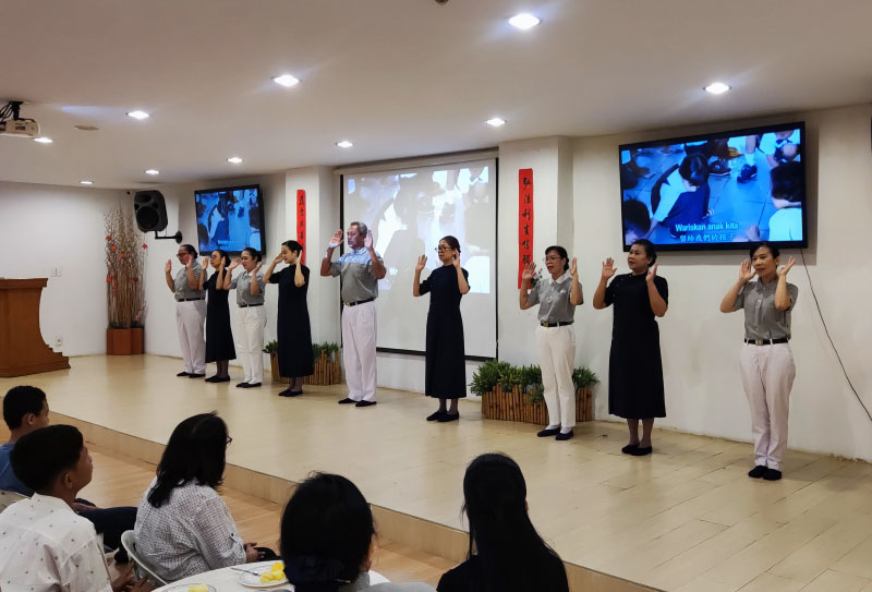 Acara juga menampilkan isyarat tangan “Dunia yang bersih” yang dibawakan tim relawan. Melalui penampilan isyarat tangan bisa menyampaikan pesan yang mudah diingat dalam mengajak peserta agar lebih peduli terhadap bumi. Selain itu pada sesi yang lain, para Gan En Hu juga diberi kesempatan untuk tampil memperagakan isyarat tangan “Satu Keluarga” di depan panggung. Mereka memperagakan isyarat tangan “Satu Keluarga” dengan baik.
