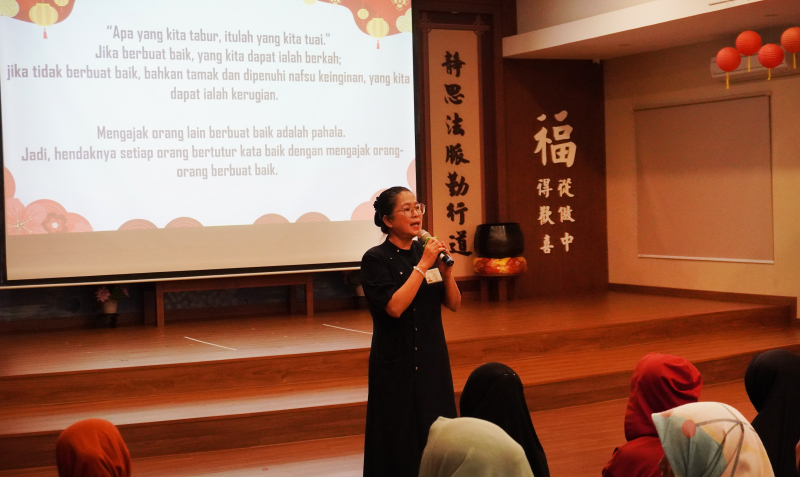 Lina sebagai pembawa materi, menjabarkan Kata Perenungan Master Cheng Yen “Berkah tidak diperoleh dengan cara memohon, tapi harus diciptakan”