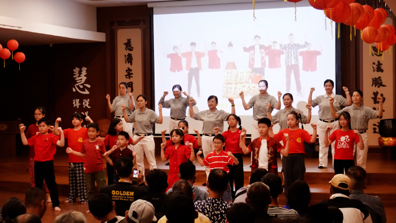Penampilan relawan Tzu Chi dan anak-anak kelas budi pekerti memperagakan isyarat tangan dengan lagu Imlek yang berjudul - jiàn kāng guò hǎo nián (Sehat Menyambut Tahun Baru).