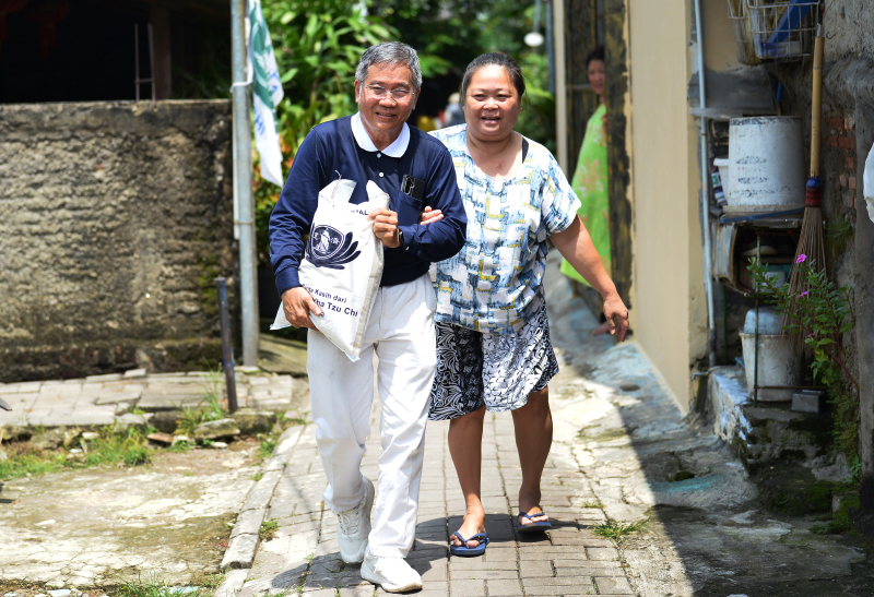 Relawan Junus Sutojo dengan sigap membantu membawakan beras milik Elan warga Kedaung Wetan yang kesulitan berjalan setelah menerima Paket Cinta Kasih Imlek dari Tzu Chi.