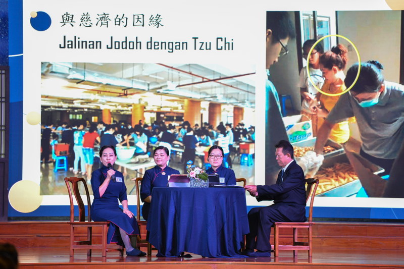 Hartini Harta Winata, Wylen Djap, dan Budiankes Yuswanto membagikan kisah perjalanan relawan Tzu Chi, dipandu moderator Christine Tjien.