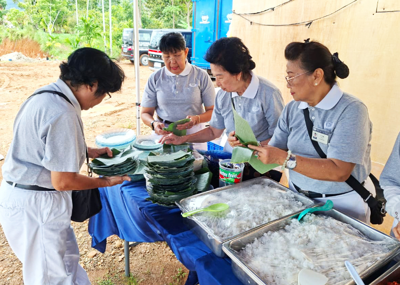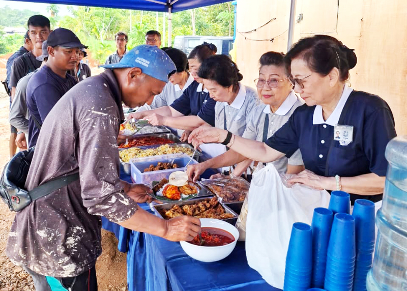 Setelah seluruh hidangan selesai disiapkan, sekitar pukul 11.30 relawan tiba di lokasi. Perlengkapan serta makanan mulai ditata dengan rapi di atas meja. Sebanyak 55 pekerja berkumpul untuk makan bersama. Para pekerja yang biasanya makan seadanya di antara tumpukan material bangunan, hari itu dapat duduk bersama relawan dalam satu meja, merasakan kebersamaan yang penuh cinta kasih.