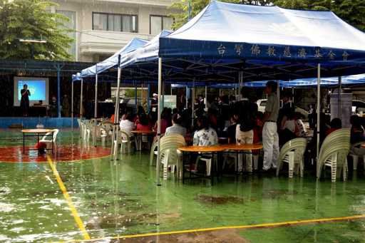 Cuaca memang tak dapat diprediksi. Tak lama setelah acara berlangsung, awan mendung mulai menghiasi langit yang disusul dengan guyuran hujan deras. Meski harus bersembunyi di bawah payung dan tenda, 80 warga yang hadir dalam acara ini tetap antusias. Begitu pula dengan para relawan, antusiasme para warga semakin menambah semangat para relawan Tzu Chi untuk mensosialisasikan misi-misi Tzu Chi.