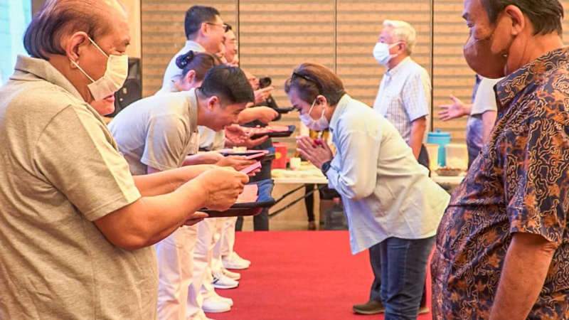 Relawan Tzu Chi Jambi memperagakan isyarat tangan Satu Keluarga yang diikuti oleh seluruh peserta Pemberkahan Akhir Tahun 2022 Tzu Chi Jambi.