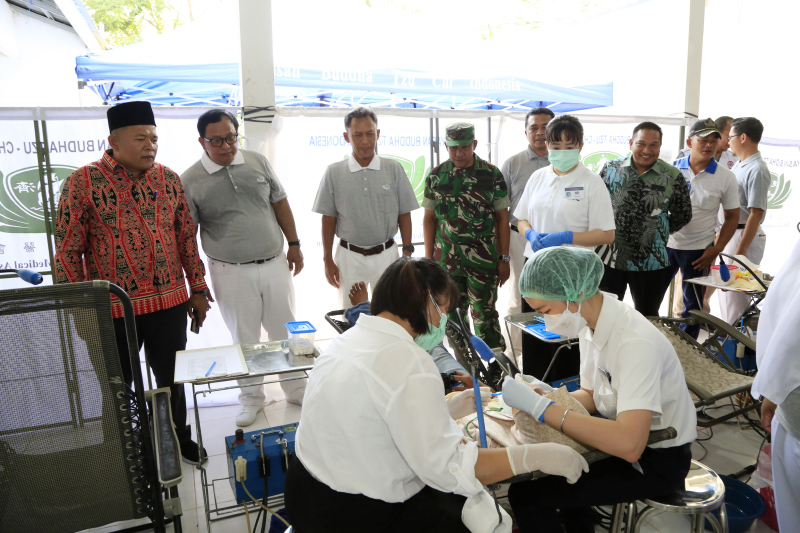 Jonner Partaonan Harahap (batik merah), Wakil Ketua DPRD Padang Lawas Utara, meninjau lokasi pemeriksaan gigi dan umum didampingi oleh relawan Tuz Chi Cabang Sinar Mas dari Xie Li Sumut Utara dan Selatan.