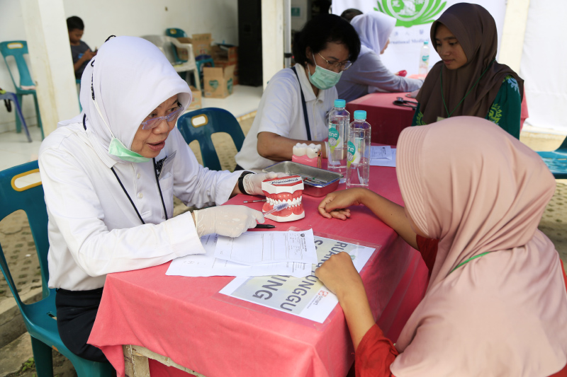 drg. Laksmi dan drg. Isti memberikan penyuluhan cara merawat gigi yang benar dan pola hidup sehat kepada warga sebelum pemeriksaan.