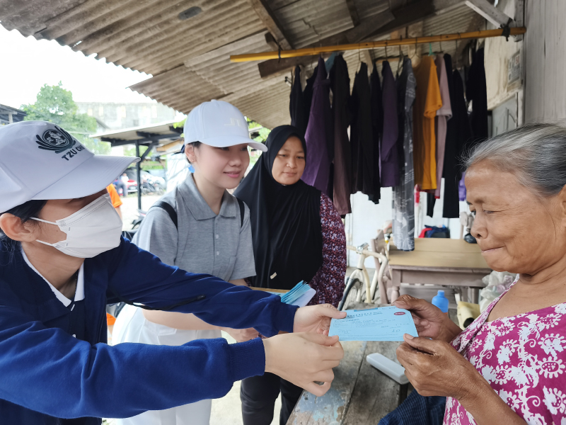 PIC kegiatan, Fonny, menyerahkan secara simbolis beras cinta kasih dari Yayasan Buddha Tzu Chi kepada Ibu Soleha di gubuk kecilnya yang sederhana.