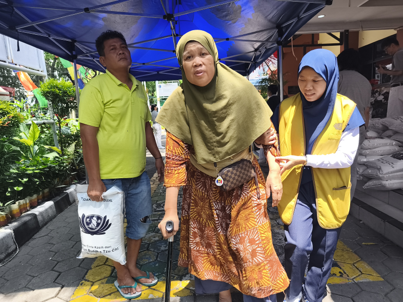 Di bawah tenda kegiatan, Armi, penerima manfaat dituntun dengan penuh perhatian oleh relawan Kembang Tzu Chi, setelah menerima Beras Cinta Kasih.