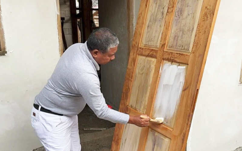 Relawan Tzu Chi Cabang Sinar Mas dari komunitas Xie Li Sumatra Selatan 2 secara berkala datang berkunjung saat proses renovasi rumah dan turut membantu pengecatan pintu rumah.