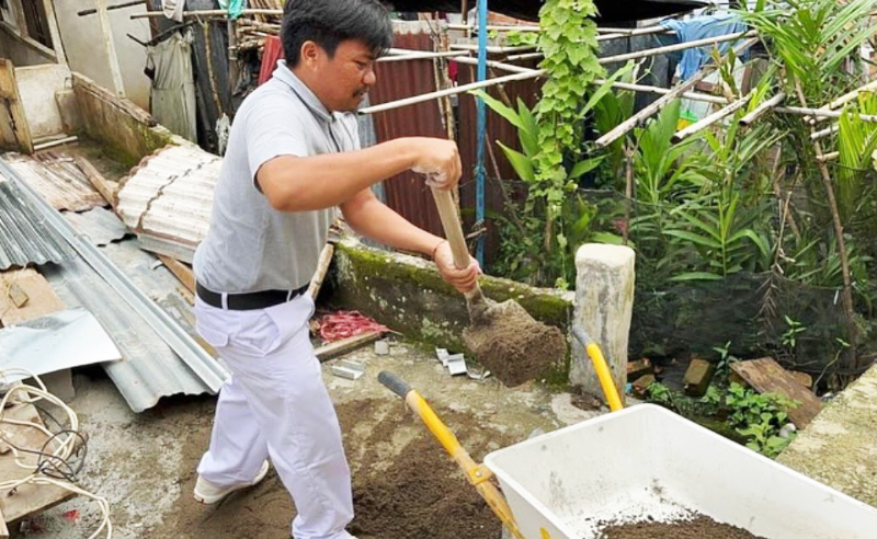 Relawan Tzu Chi Cabang Sinar Mas dari komunitas Xie Li Sumatra Selatan 2 membantu mengaduk pasir dan semen agar rumah Ibu Emi cepat selesai sesuai harapan. Perbaikan rumah membutuhkan waktu sekitar tiga minggu dan para relawan secara berkala datang meninjau untuk memastikan pengerjaan berjalan sesuai rencana.