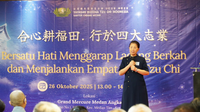 Ketua Yayasan Buddha Tzu Chi Indonesia, Liu Su Mei juga memberikan pesan cinta kasih agar relawan Tzu Chi Medan bersatu hati dalam membangun Aula Jing Si.