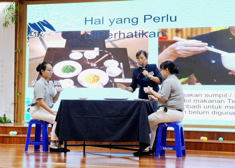 Pada sesi ini, Intan dan Dora turut memperagakan tata cara makan yang benar, mulai dari cara memegang sumpit dan mangkuk, posisi duduk, hingga etika saat berada di meja makan. Melalui materi ini, peserta diharapkan menyadari bahwa pembinaan diri dimulai dari hal-hal kecil yang dilakukan dengan kesadaran dan ketulusan.