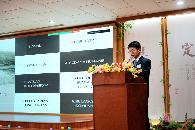 Adi menyampaikan materi tentang Kisah dan Kemandirian Master Cheng Yen, yang mengajak peserta memahami perjalanan hidup penuh keteguhan dan nilai pembinaan diri dalam menjalankan misi kemanusiaan.
