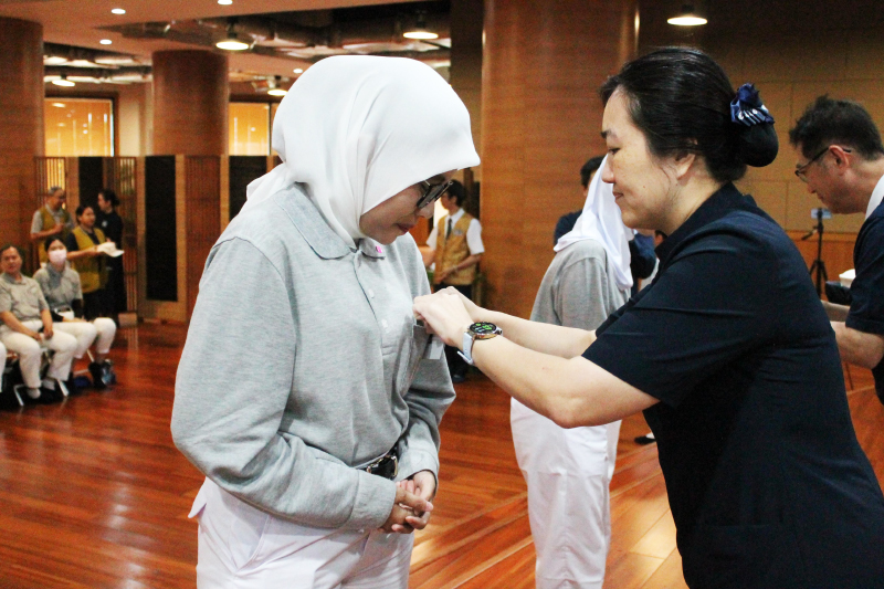 Wylen Ketua He Qi Jakarta Barat 3 menyematkan name tag kepada peserta yang dilantik sebagai relawan abu putih, menjadi momen penuh makna sebagai tanda awal perjalanan baru dalam melatih diri dan mengabdi kepada masyarakat.