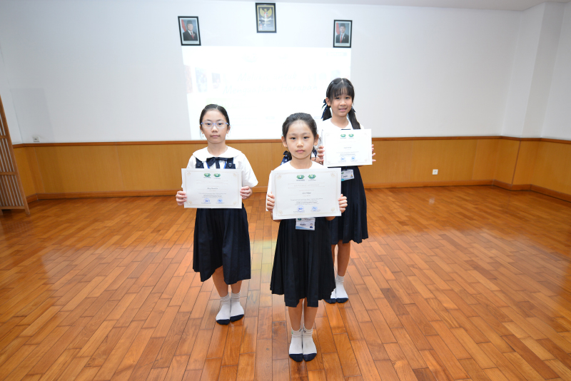 Tiga siswi Primary Tzu Chi School yaitu Claire Widjaja (tengah), Hillary Nirmala Xu (kiri), dan Jesslyn Faith Tjai (kanan), menerima sertifikat penghargaan dari Tzu Chi Hospital dan Tzu Chi School atas sumbangsih yang telah diberikan.