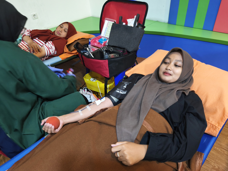 Aldila Riska Pramudita tampak menjalani proses donor darah, menyalurkan setetes demi setetes kehidupan melalui jarum selang infus.