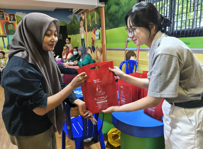 Dengan penuh senyum, Natalie, relawan Tzu Chi, menyerahkan bingkisan sebagai tanda apresiasi kepada Aldila usai mendonorkan darah.