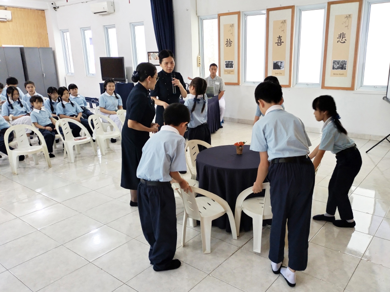 Anak-anak diajarkan budaya humanis Tzu Chi dalam etika berpakaian, berjalan, duduk, menempati meja makan dan sikap saat makan melalui praktik langsung.