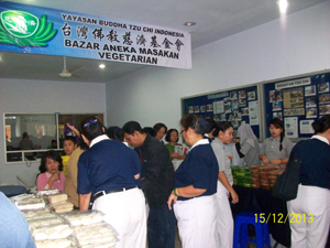 Beberapa kendala sempat timbul dalam bazar, seperti proses mempersiapkan makanan yang memerlukan waktu sehingga pengunjung terpaksa menunggu. Untuk mengisi waktu tunggu tersebut, selain menjual makanan vegetarian, relawan Tzu Chi Makassar juga menyediakan tempat khusus yang menjual buku-buku tentang Tzu Chi. Dengan demikian, sembari menunggu makanan datang, para pengunjung dapat membaca buku perenungan atau buku-buku Tzu Chi lainnya. Lantunan lagu-lagu Tzu Chi yang merdu dan menyejukkan hati pun membuat pengunjung betah dan dapat menikmati suasana bazar. Sembari makan bersama keluarga, pengunjung dapat menjaga kesehatan, melestarikan lingkungan, dan menjalin jodoh baik. | |||