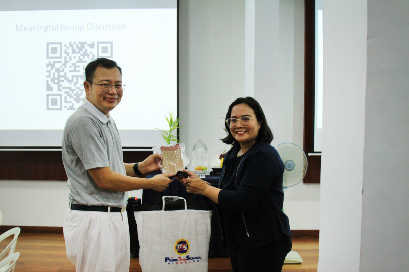 Jumin memberikan cendera mata kepada Bu Citra, Wakil Kepala Sekolah Prime One School Medan.