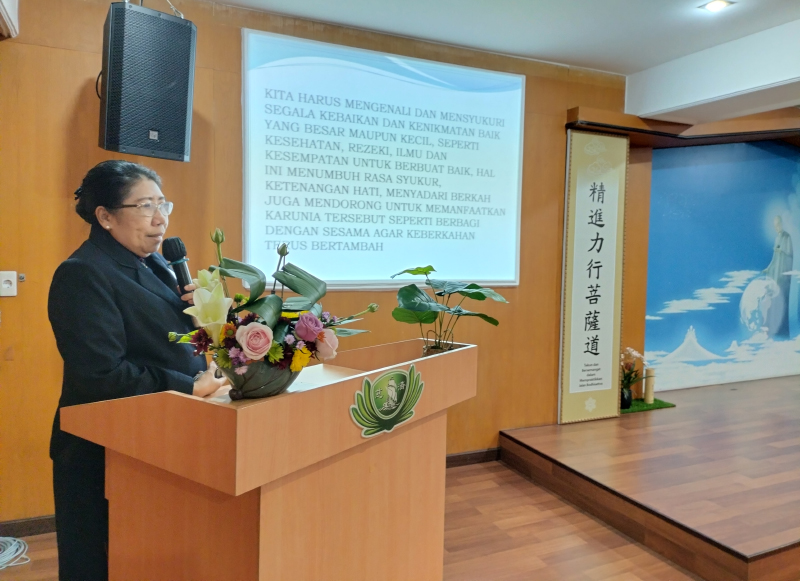Imelda berbagi pengetahuan asal mula misi amal Tzu Chi.