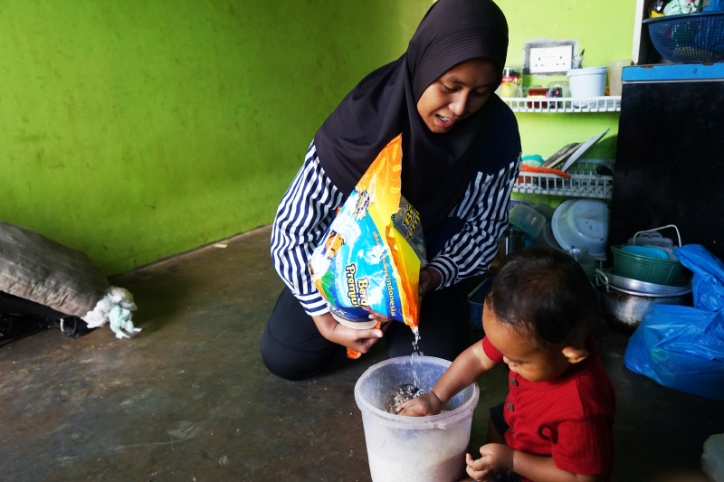 Rani menuangkan beras cinta kasih dari Tzu Chi, simbol kepedulian yang diharapkan dapat membawa manfaat bagi warga penerima.