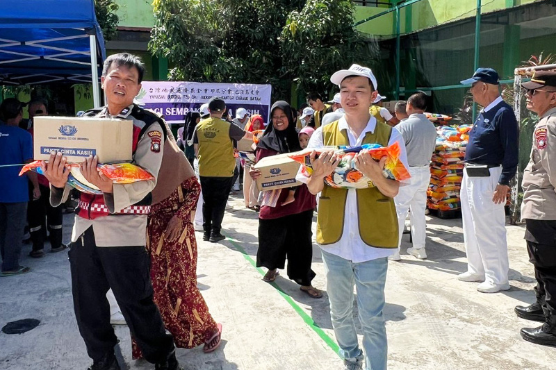 Relawan Tzu Chi secara simbolis bersama TNI-POLRI dan pemerintah daerah menyerahkan paket sembako kepada warga terdiri dari beras 10 kilogram, minyak goreng 1 liter, mi telur 5 bungkus, sirup 2 botol, gula pasir 1 kilogram, dan kecap manis 1 bungkus.